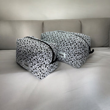 This beautiful bag features a striking pattern of black flowers on a crisp white exterior, creating a timeless and sophisticated look. Inside, you'll find a chic black and white checkered interior, adding a touch of playful contrast. Perfect for organizing your makeup and skincare essentials, this unique bag is as stylish as it is functional. Treat yourself or a loved one to this delightful accessory that promises to add a dash of charm and elegance to your daily routine